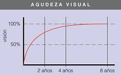Desarrollo de la Agudeza visual: Al nacer la visión del niño es muy poca pero se desarrolla rápidamente en los primeros años de vida. A los 4 años ya casi tiene la visión del adulto, que estará ya plenamente desarrollada a los 8 años.